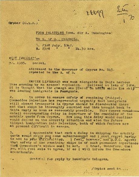 1947 – imigrancki statek Sziwat Zion, który wypłynal 16 lipca z Algiers, zostaje opanowany przez Brytyjczyków, doprowadzony do portu w Hajfie, imigranci zostają usunięci ze statku i deportowani do obozu na Cyprze...